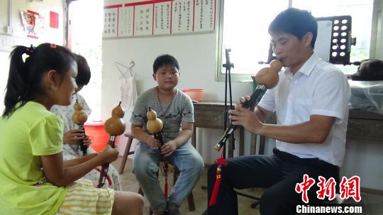 李支友教學(xué)生吹葫蘆絲。 通訊員 夏程鵬 攝