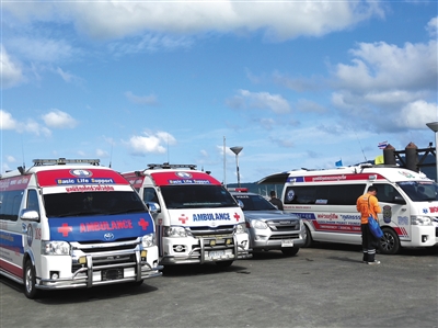 7月6日,泰國(guó)普吉島查龍碼頭,救援車輛??吭诖a頭等待。 通訊員 卜志輝 攝