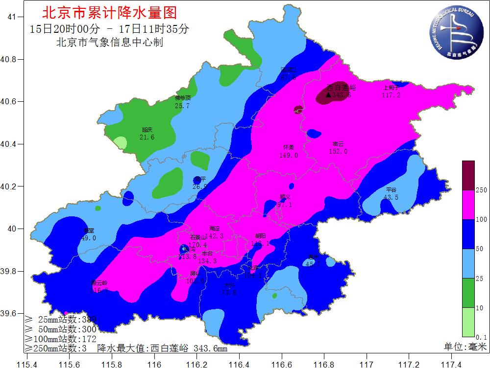 根據(jù)氣象觀測(cè),15日20時(shí)至17日8時(shí),北京市平均降水量達(dá)77.7毫米,城區(qū)平均100.9毫米,全市453個(gè)氣象觀測(cè)站中有121個(gè)超過(guò)100毫米、12個(gè)超過(guò)200毫米。其中,密云有2個(gè)測(cè)站超過(guò)300毫米,分別是西白蓮峪達(dá)(336毫米)和捧河巖村(302毫米)。