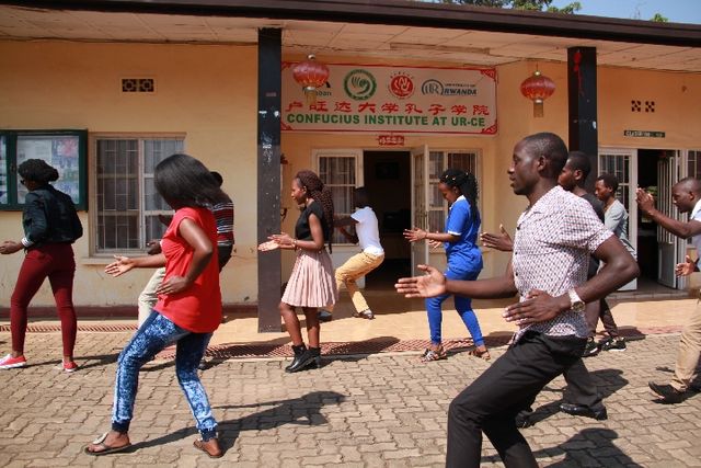 來到盧旺達(dá)大學(xué)孔子學(xué)院,正趕上老師們帶領(lǐng)參加暑期班的同學(xué)們在操場上打太極拳。一招一式,頗有章法。