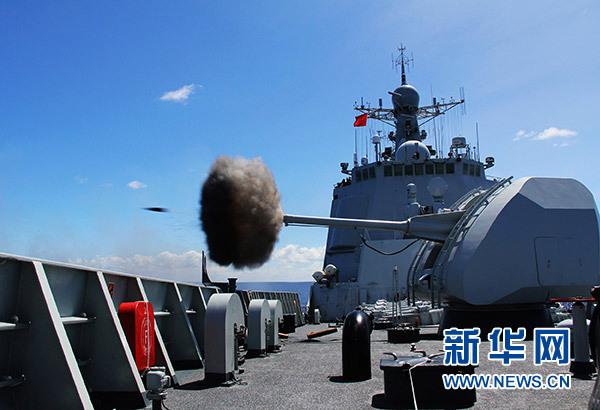 在多國聯(lián)演任務(wù)中,??谂炦M行主炮射擊(2014年6月19日攝)。 新華社發(fā)(于林 攝)