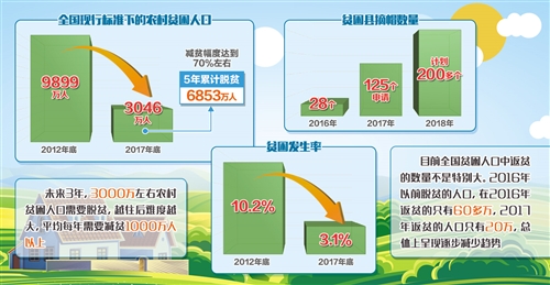在以習(xí)近平同志為核心的黨中央堅(jiān)強(qiáng)領(lǐng)導(dǎo)下,脫貧攻堅(jiān)力度之大、規(guī)模之廣、影響之深前所未有。經(jīng)過幾年的努力,脫貧攻堅(jiān)取得決定性進(jìn)展:全國(guó)現(xiàn)行標(biāo)準(zhǔn)下的農(nóng)村貧困人口由2012年底的9899萬人,減少到2017年底的3046萬人,5年累計(jì)脫貧6853萬人,減貧幅度達(dá)到70%左右。貧困發(fā)生率由2012年底的10.2%下降到2017年底的3.1%。貧困縣數(shù)量實(shí)現(xiàn)了首次減少,2016年有28個(gè)貧困縣脫貧摘帽,2017年有125個(gè)貧困縣申請(qǐng)摘帽,今年計(jì)劃200多個(gè)縣摘帽,解決區(qū)域性整體貧困邁出堅(jiān)實(shí)步伐。貧困地區(qū)群眾生產(chǎn)生活條件明顯改善,貧困群眾收入水平明顯提高、獲得感明顯增強(qiáng)。