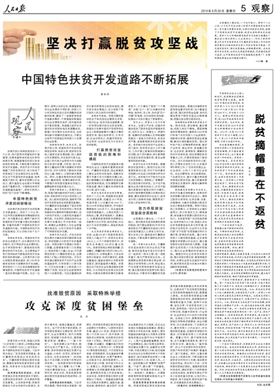 全面建成小康社會,一個也不能少。黨的十八大以來,以習近平同志為核心的黨中央圍繞脫貧攻堅作出一系列重大部署和安排,全面打響脫貧攻堅戰(zhàn),拓展了中國特色扶貧開發(fā)道路,脫貧攻堅取得決定性進展。黨的十九大明確把精準脫貧作為決勝全面建成小康社會必須打好的三大攻堅戰(zhàn)之一,作出了新的部署?!吨泄仓醒雵鴦赵宏P于打贏脫貧攻堅戰(zhàn)三年行動的指導意見》為推動脫貧攻堅工作更加有效開展進一步完善頂層設計、強化政策措施、加強統(tǒng)籌協(xié)調。在未來兩年多時間里,如何攻克深度貧困堡壘,實現(xiàn)穩(wěn)定脫貧不返貧,讓中國特色扶貧開發(fā)道路越走越寬廣?本期觀察版圍繞這些問題進行探討。