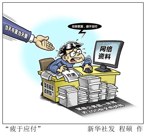 湖北省某縣委政研室干部說,一些黨員干部特別是領(lǐng)導干部能力不濟,把發(fā)文、開會當作抓落實的主要方式方法,甚至將其做成履職盡責、推卸責任的“痕跡”,一些文件層層轉(zhuǎn)發(fā)、照抄照轉(zhuǎn),很多時候并無新的實質(zhì)性內(nèi)容,完全是重復上級精神,造成基層干部有看不完的文件、開不完的會。