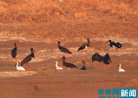 河南省孟津縣黃河濕地國家級(jí)自然保護(hù)區(qū)內(nèi)的黑鸛(黃河濕地孟津管理局供圖)