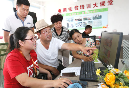 電商培訓中心工作人員(前左)在指導貧困戶通過網(wǎng)絡銷售農(nóng)產(chǎn)品