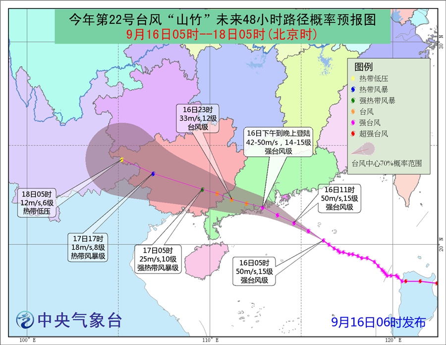 今年第22號臺風(fēng)“山竹”(強(qiáng)臺風(fēng)級)將以每小時30公里左右的速度向西偏北方向移動,將于16日下午到晚上在廣東珠海到吳川一帶沿海登陸(14~15級,42~50米/秒,強(qiáng)臺風(fēng)級),登陸后將繼續(xù)向西偏北方向移動,強(qiáng)度逐漸減弱。中央氣象臺9月16日06時繼續(xù)發(fā)布臺風(fēng)紅色預(yù)警。預(yù)計16日08時至17日08時,南海中北部、臺灣海峽、巴士海峽、瓊州海峽、北部灣、福建沿海、廣東沿海及廣東中南部、珠江口、香港、澳門、海南島東部和北部沿海、廣西東部及沿海將有7~10級大風(fēng),陣風(fēng)11~12級;其中南海北部、廣東大部沿海、珠江口、香港、澳門將有11~13級大風(fēng),陣風(fēng)14~15級,“山竹”中心經(jīng)過的附近海面或地區(qū)風(fēng)力可達(dá)14~15級,陣風(fēng)16~17級。