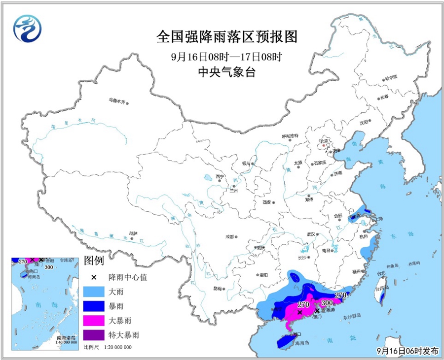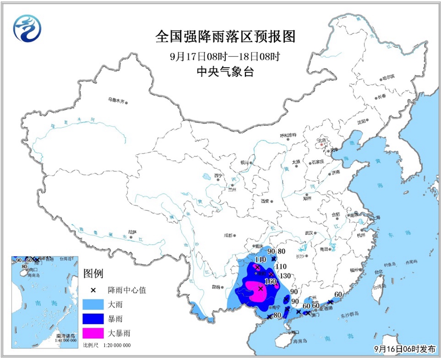 受臺風(fēng)“山竹”影響,預(yù)計9月16日至18日,華南大部、貴州、云南東部和南部等地將有大到暴雨,其中廣東中南部、香港、澳門、廣西西部和中南部、海南島北部、貴州中南部、云南東南部和西南部等地的部分地區(qū)有大暴雨,局地有特大暴雨,上述地區(qū)過程降水量100~200毫米,局地可達(dá)250~400毫米,最大小時雨強(qiáng)可達(dá)40~60毫米,局地可超過80毫米。中央氣象臺9月16日06時繼續(xù)發(fā)布暴雨橙色預(yù)警。