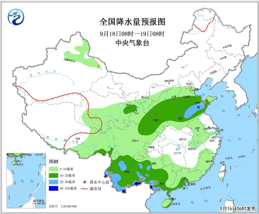 9月18日08時至19日08時,新疆東北部、西藏東部、西北地區(qū)大部、華北大部、黃淮、江淮大部、江南南部、西南地區(qū)和華南等地的部分地區(qū)有小到中雨,其中,山東中南部、貴州西南部、云南東部和西南部、廣西西南部等地的部分地區(qū)有大雨,局地暴雨(50~60毫米)(見圖6)。臺灣海峽、巴士海峽、南海東北部和中東部海域?qū)⒂?~6級、陣風(fēng)7級的東北風(fēng)或偏東風(fēng),南海西北部和中西部海域、北部灣將有4~6級東南風(fēng),南海西南部海域?qū)⒂?~6級西南風(fēng)。