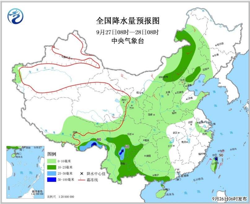 據(jù)中央氣象臺(tái)網(wǎng)站消息,9月26日至27日,西南地區(qū)和廣西等地局地有強(qiáng)降雨。9月26日至29日,冷空氣影響我國(guó)北方地區(qū),新疆局地氣溫將下降8~10℃。