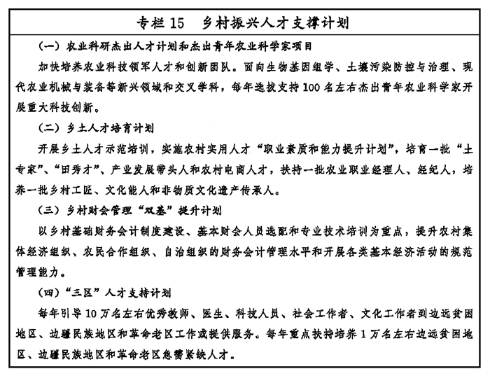 建立健全激勵(lì)機(jī)制,研究制定完善相關(guān)政策措施和管理辦法,鼓勵(lì)社會(huì)人才投身鄉(xiāng)村建設(shè)。以鄉(xiāng)情鄉(xiāng)愁為紐帶,引導(dǎo)和支持企業(yè)家、黨政干部、專家學(xué)者、醫(yī)生教師、規(guī)劃師、建筑師、律師、技能人才等,通過下鄉(xiāng)擔(dān)任志愿者、投資興業(yè)、行醫(yī)辦學(xué)、捐資捐物、法律服務(wù)等方式服務(wù)鄉(xiāng)村振興事業(yè),允許符合要求的公職人員回鄉(xiāng)任職。落實(shí)和完善融資貸款、配套設(shè)施建設(shè)補(bǔ)助、稅費(fèi)減免等扶持政策,引導(dǎo)工商資本積極投入鄉(xiāng)村振興事業(yè)。繼續(xù)實(shí)施“三區(qū)”(邊遠(yuǎn)貧困地區(qū)、邊疆民族地區(qū)和革命老區(qū))人才支持計(jì)劃,深入推進(jìn)大學(xué)生村官工作,因地制宜實(shí)施“三支一扶”、高校畢業(yè)生基層成長(zhǎng)等計(jì)劃,開展鄉(xiāng)村振興“巾幗行動(dòng)”、青春建功行動(dòng)。建立城鄉(xiāng)、區(qū)域、校地之間人才培養(yǎng)合作與交流機(jī)制。全面建立城市醫(yī)生教師、科技文化人員等定期服務(wù)鄉(xiāng)村機(jī)制。