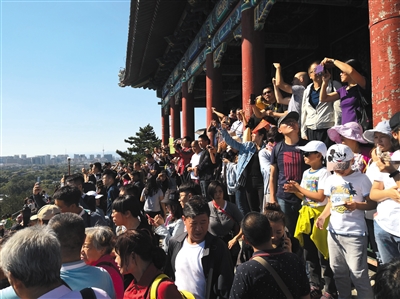 10月2日,景山公園內(nèi),游客在萬春亭眺望故宮全景。 新京報(bào)記者 王飛 攝