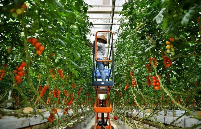 在海南省陵水現(xiàn)代農(nóng)業(yè)示范基地,工人在管理通過擱架吊蔓式栽培技術(shù)種植的詹妮瑞番茄。新華社記者 郭程 攝