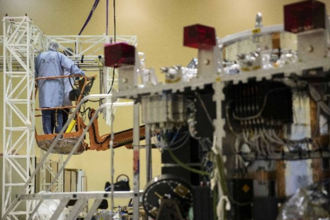 2018年8月31日,在位于巴西圣保羅州圣若澤杜斯坎普斯市的巴西國(guó)家空間研究所,工作人員在中巴地球資源04A衛(wèi)星旁工作。新華社記者李明攝