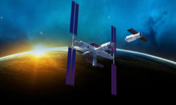 中國(guó)空間站構(gòu)想圖。(中國(guó)航天科技集團(tuán)五院供圖)