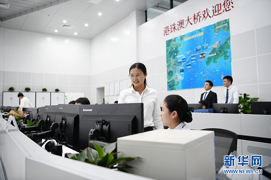 港珠澳大橋管理局營運(yùn)管理部部長江曉霞(中間站立者)在調(diào)度中心查看大橋車輛通行情況(10月24日攝)。新華社記者梁旭攝