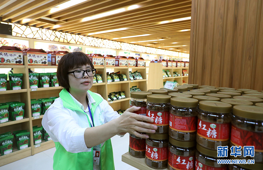 在英德市電子商務(wù)產(chǎn)業(yè)園,農(nóng)特產(chǎn)品o2o體驗(yàn)館的工作人員將本地電商企業(yè)生產(chǎn)的紅糖商品上架展銷(10月24日攝)。新華社記者王瑞平攝
