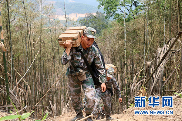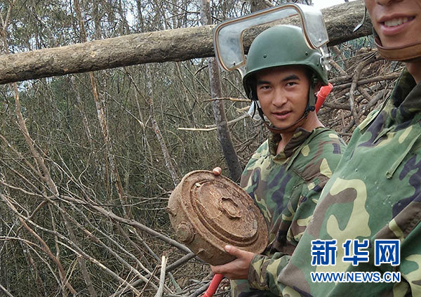 這是杜富國(guó)(前)在轉(zhuǎn)運(yùn)爆炸物途中(資料照片)。新華社發(fā)(黃巧 攝)