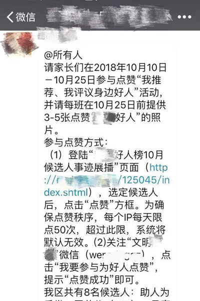 近日,廣東某所幼兒園的家長(zhǎng)們又在群里收到老師發(fā)的通知:“請(qǐng)家長(zhǎng)們?cè)?018年10月10日-10月25日參與點(diǎn)贊‘我推薦、我評(píng)議身邊好人’活動(dòng),并請(qǐng)每班在10月25日前提供3-5張點(diǎn)贊的照片。”