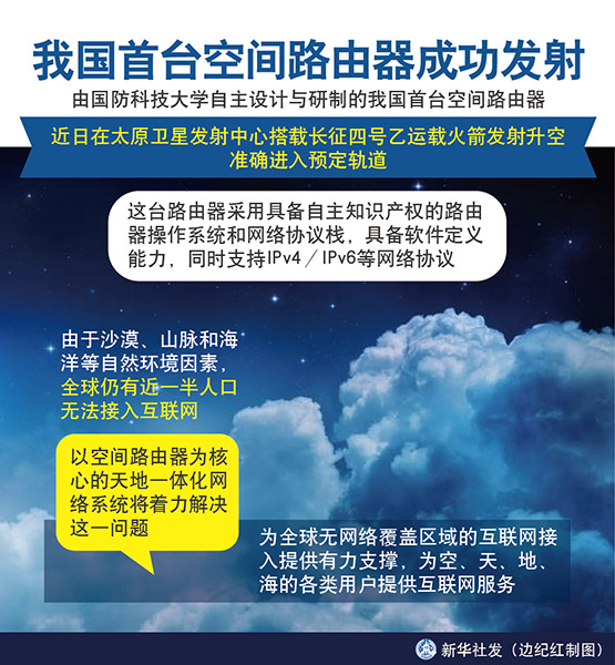 新華社長沙10月29日電(趙寶康、劉于藍(lán))由國防科技大學(xué)自主設(shè)計(jì)與研制的我國首臺(tái)空間路由器,近日在太原衛(wèi)星發(fā)射中心搭載長征四號(hào)乙運(yùn)載火箭發(fā)射升空,準(zhǔn)確進(jìn)入預(yù)定軌道。