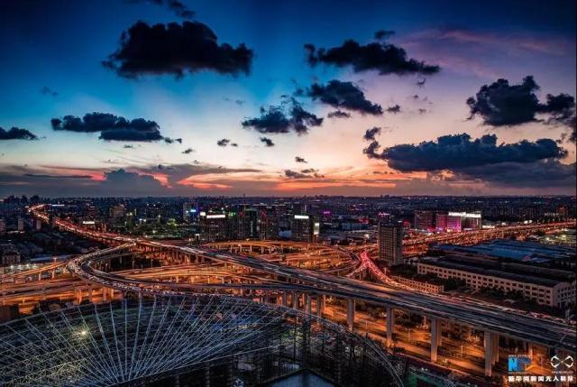 ↑傍晚時(shí)刻的上海立交橋。新華網(wǎng)發(fā) 田橫 攝