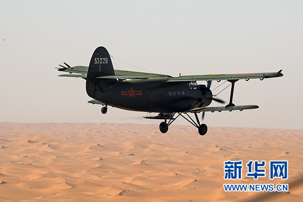 空軍運-5B飛機在騰格里沙漠上空進行飛播作業(yè)(5月31日攝)。新華社發(fā)(劉彥令 攝)