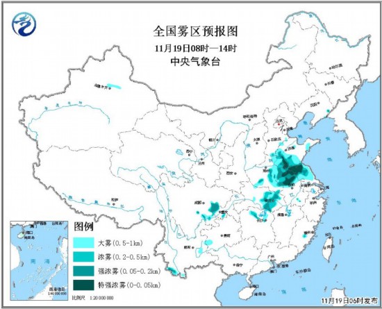 預(yù)計(jì),11月19日早晨至上午,山東西部、河南中東部、安徽中北部、江蘇中北部、湖北中東部、四川盆地中部等地有大霧,其中山東西南部、安徽北部、江蘇北部等地的部分地區(qū)有能見度不足50米的特強(qiáng)濃霧。