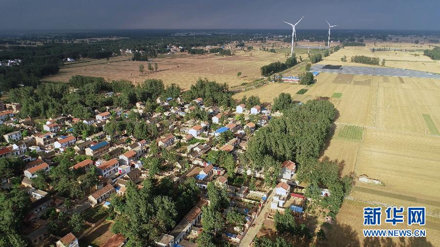 這是6月20日無人機(jī)拍攝的河南蘭考縣東壩頭鄉(xiāng)張莊村周圍的麥田和風(fēng)機(jī)。 新華社記者 馮大鵬 攝