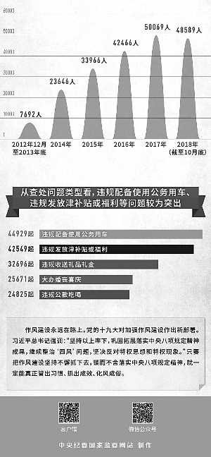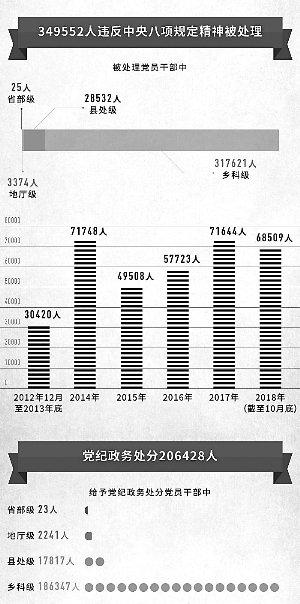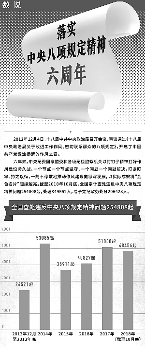 六年來,中央紀委國家監(jiān)委和各級紀檢監(jiān)察機關(guān)以釘釘子精神打好作風建設(shè)持久戰(zhàn),一個節(jié)點一個節(jié)點堅守,一個問題一個問題解決,盯緊盯牢、持之以恒,一刻不停歇地推動作風建設(shè)向縱深發(fā)展,以實際成效將“金色名片”越擦越亮。截至2018年10月底,全國累計查處違反中央八項規(guī)定精神問題254808起,處理349552人,給予黨紀政務(wù)處分206428人。