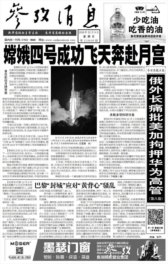 《參考消息》頭版報道嫦娥四號成功發(fā)射升空