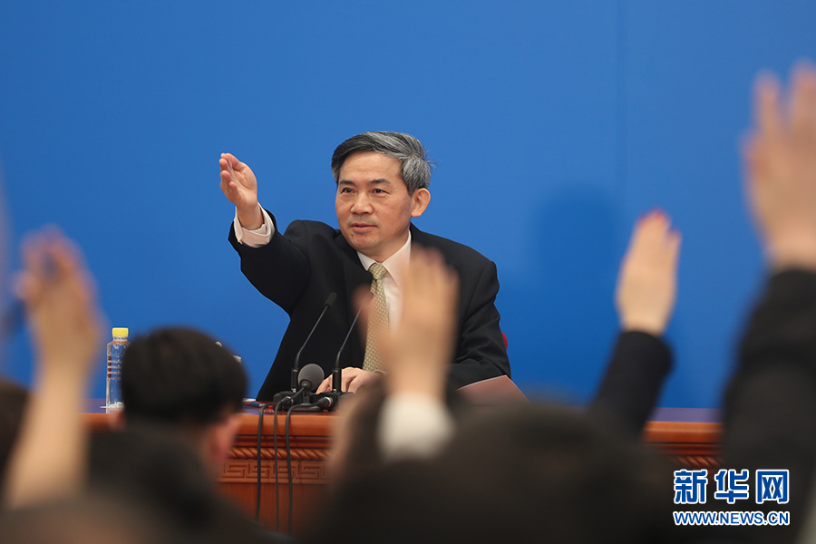 3月4日,十三屆全國人大一次會議在人民大會堂新聞發(fā)布廳舉行新聞發(fā)布會,由大會發(fā)言人張業(yè)遂就大會議程和人大工作相關(guān)的問題回答中外記者的提問。圖為新聞發(fā)布會主持人何紹仁。新華網(wǎng)/中國政府網(wǎng) 陳杰 攝