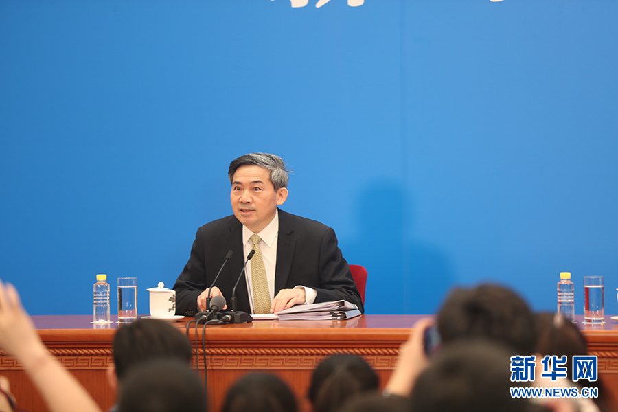 3月4日,十三屆全國人大一次會議在人民大會堂新聞發(fā)布廳舉行新聞發(fā)布會,由大會發(fā)言人張業(yè)遂就大會議程和人大工作相關(guān)的問題回答中外記者的提問。圖為新聞發(fā)布會主持人何紹仁。新華網(wǎng)/中國政府網(wǎng) 陳杰 攝