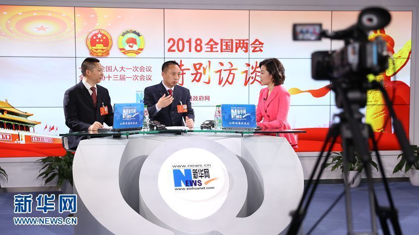 3月5日,全國(guó)人大代表、東風(fēng)商用車有限公司總裝配廠調(diào)檢一車間“王濤班”班長(zhǎng)王建清(中)做客新華網(wǎng)2018全國(guó)兩會(huì)特別訪談。新華網(wǎng) 張斌/攝