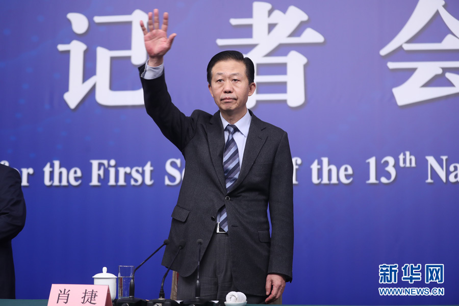 十三屆全國人大一次會議新聞中心于3月7日上午在梅地亞中心多功能廳舉行記者會,邀請財政部部長肖捷,副部長史耀斌、胡靜林就“財稅改革和財政工作”相關(guān)問題回答中外記者提問。圖為財政部部長肖捷向記者舉手示意。新華網(wǎng)/中國政府網(wǎng)?翟子赫 攝