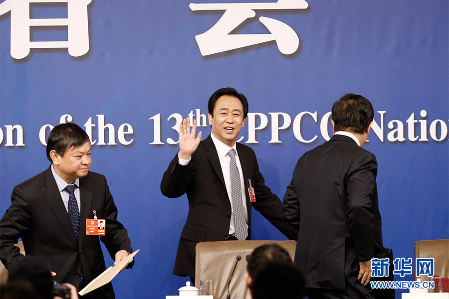 3月10日8時(shí)45分,全國政協(xié)十三屆一次會議在梅地亞中心多功能廳舉行記者會,邀請5位全國政協(xié)委員就“提高保障和改善民生水平”回答記者提問。圖為記者會結(jié)束后,許家印與記者們揮手告別。新華網(wǎng)/中國政府網(wǎng) 翟子赫 攝