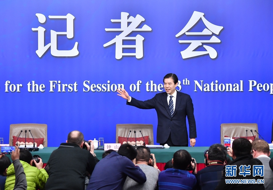 3月11日,十三屆全國(guó)人大一次會(huì)議新聞中心舉行記者會(huì),邀請(qǐng)商務(wù)部部長(zhǎng)鐘山、副部長(zhǎng)兼國(guó)際貿(mào)易談判副代表王受文、副部長(zhǎng)錢克明就“推動(dòng)形成全面開放新格局推動(dòng)商務(wù)事業(yè)高質(zhì)量發(fā)展”相關(guān)問(wèn)題回答中外記者提問(wèn)。這是鐘山向記者揮手致意。 新華社記者 李鑫 攝
