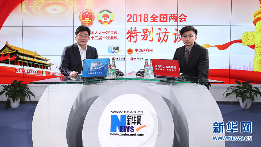 3月11日,全國政協(xié)委員、中國人民大學校長劉偉(左)做客新華網(wǎng)2018全國兩會特別訪談。新華網(wǎng)?郭小天攝