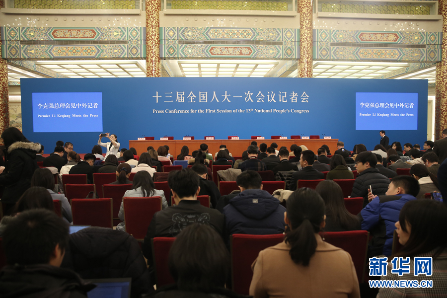 3月20日上午,十三屆全國人大一次會議閉幕后,國務(wù)院總理李克強將在人民大會堂三樓金色大廳會見采訪十三屆全國人大一次會議的中外記者并回答記者提出的問題。圖為記者會現(xiàn)場。 新華網(wǎng)/中國政府網(wǎng) 翟子赫 攝