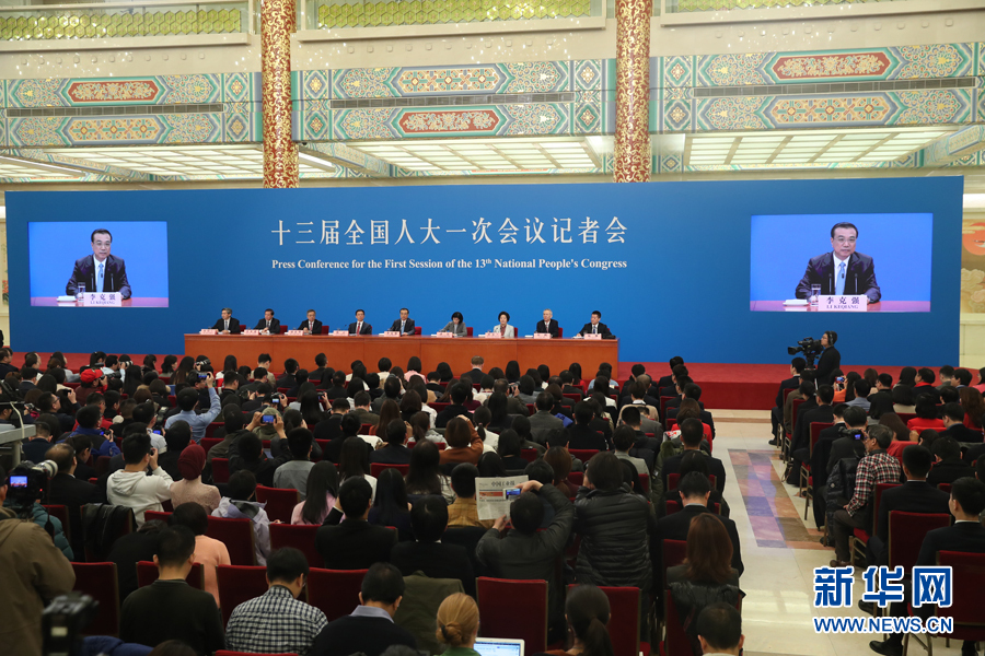 3月20日上午,十三屆全國人大一次會議閉幕后,國務院總理李克強在人民大會堂三樓金色大廳會見采訪十三屆全國人大一次會議的中外記者并回答記者提出的問題。圖為記者會現(xiàn)場。 新華網(wǎng)/中國政府網(wǎng) 翟子赫 攝
