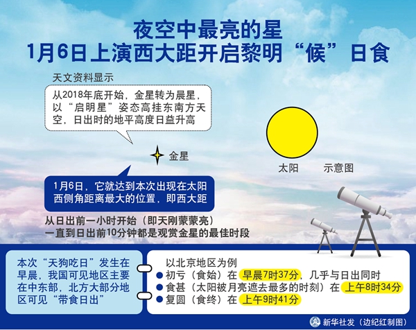 新華社天津1月4日電(記者周潤(rùn)健)對(duì)于天文愛好者來說,本月6日注定會(huì)是一個(gè)忙碌的早晨,看完西大距的金星,就可以繼續(xù)欣賞一次精彩的日偏食。