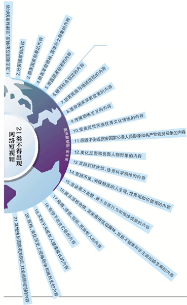 《規(guī)范》和《細(xì)則》針對網(wǎng)絡(luò)視聽領(lǐng)域存在的不足和薄弱環(huán)節(jié),分別對開展短視頻服務(wù)的網(wǎng)絡(luò)平臺以及網(wǎng)絡(luò)短視頻內(nèi)容審核的標(biāo)準(zhǔn)進(jìn)行規(guī)范?!都?xì)則》明確了21類、100項(xiàng)內(nèi)容,“喪文化”“一夜情”“非主流婚戀觀”等都不得出現(xiàn)在短視頻中。