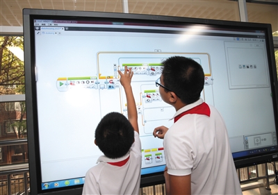 北京十八中學(xué)教育集團課程展示活動中的樂高機器人課上,學(xué)生正在為機器人編程。資料圖片/記者 王遠(yuǎn)征 攝