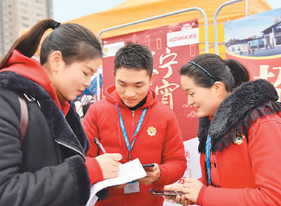 2月12日,湖北省通城縣在銀山廣場(chǎng)舉辦2019年推動(dòng)返鄉(xiāng)就業(yè)、助力脫貧攻堅(jiān)暨“春風(fēng)行動(dòng)”企業(yè)用工現(xiàn)場(chǎng)招聘會(huì),共推出1萬多個(gè)就業(yè)崗位,工種300余個(gè),可滿足本縣不同年齡段勞力在家門口就業(yè)。圖為求職者在招聘會(huì)上咨詢應(yīng)聘。劉建平攝 (人民視覺)