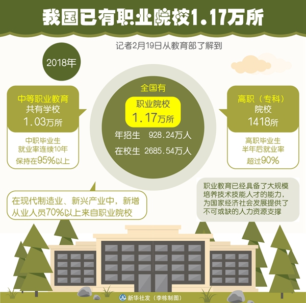 統(tǒng)計(jì)顯示,全國中等職業(yè)教育共有學(xué)校1.03萬所,高職(??疲┰盒?418所。中職畢業(yè)生就業(yè)率連續(xù)10年保持在95%以上,高職畢業(yè)生半年后就業(yè)率超過90%。在現(xiàn)代制造業(yè)、新興產(chǎn)業(yè)中,新增從業(yè)人員70%以上來自職業(yè)院校。