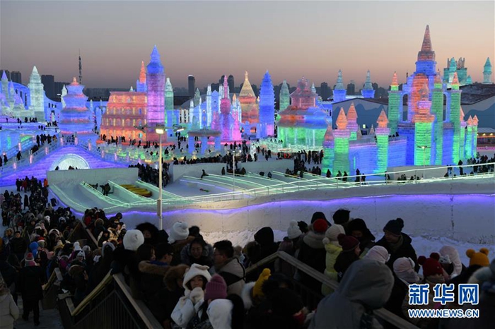 游客在哈爾濱冰雪大世界園區(qū)排隊體驗冰雪娛樂項目(1月5日攝)。新華社記者 王建威 攝