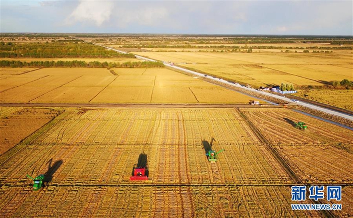 大型農(nóng)機在黑龍江省三江平原上收割水稻(2017年9月28日無人機拍攝)。新華社記者 王建威 攝