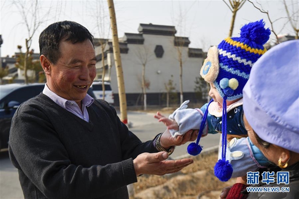 馬國(guó)權(quán)在潤(rùn)豐村的新家門前陪小孫子玩耍(2月18日攝)。新華社發(fā)(馮開(kāi)華 攝)