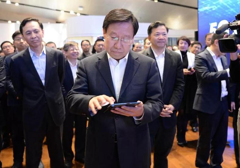 中宣部常務(wù)副部長王曉暉(中)通過華為5G折疊手機(jī)進(jìn)行4K節(jié)目投屏操作