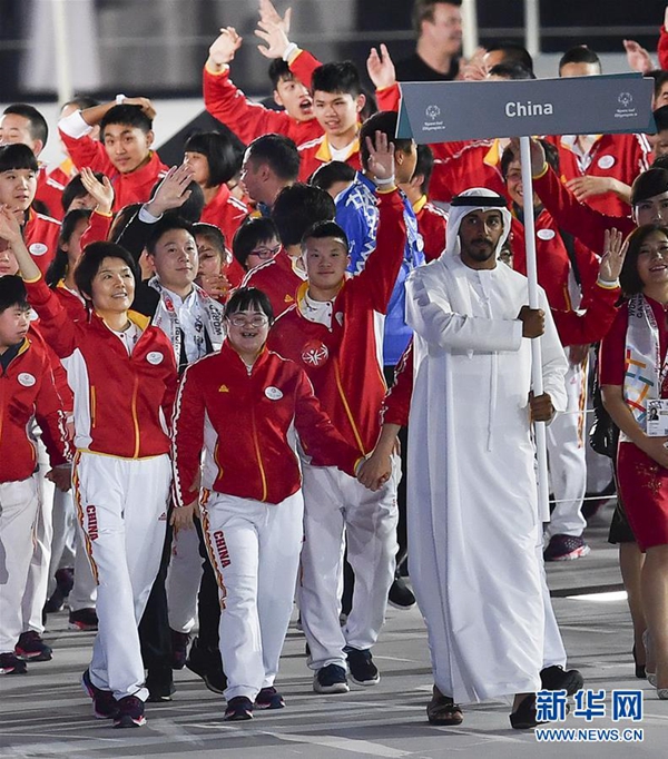 圖為3月14日,李想(中)與自己的偶像、前奧運(yùn)冠軍李小鵬(前排右五)隨中國代表團(tuán)在2019年阿布扎比夏季特奧會開幕式上入場。 新華社記者 夏一方 攝