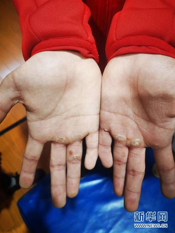 圖為李想展示手上的老繭。(李想的母親楊建英提供的資料照片) 新華社發(fā)